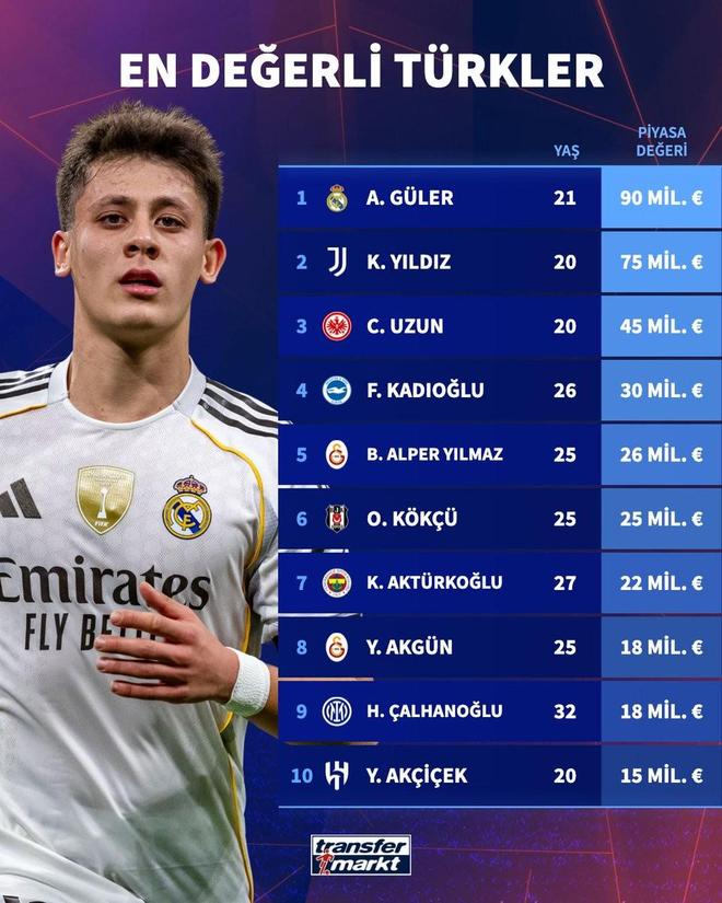 北京时间4月1日,土耳其在世预赛欧洲区附加赛的决赛中1-0小胜科索沃,顺利晋级2026年美加墨世界杯正赛,德转也列出了现役土耳其球员身价排行榜前10,皇家马德里球星居莱尔以9000万欧元高居第一,尤文图斯的凯南-伊尔迪兹7500万欧元第二。